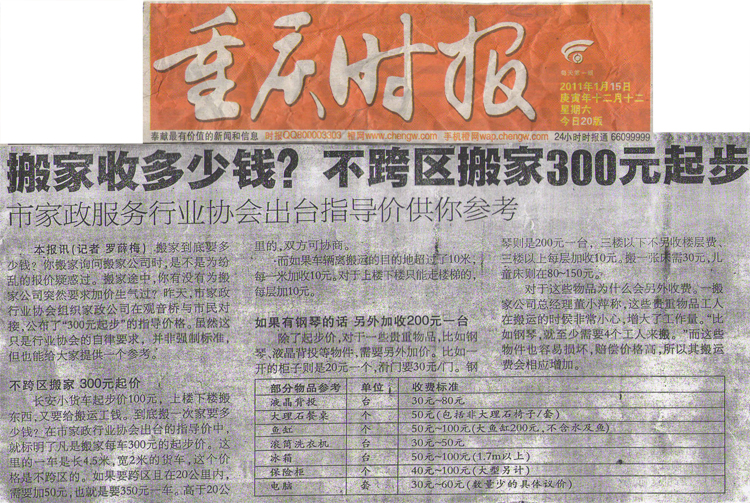2011年家政協(xié)會(huì)搬家指導(dǎo)價(jià)格